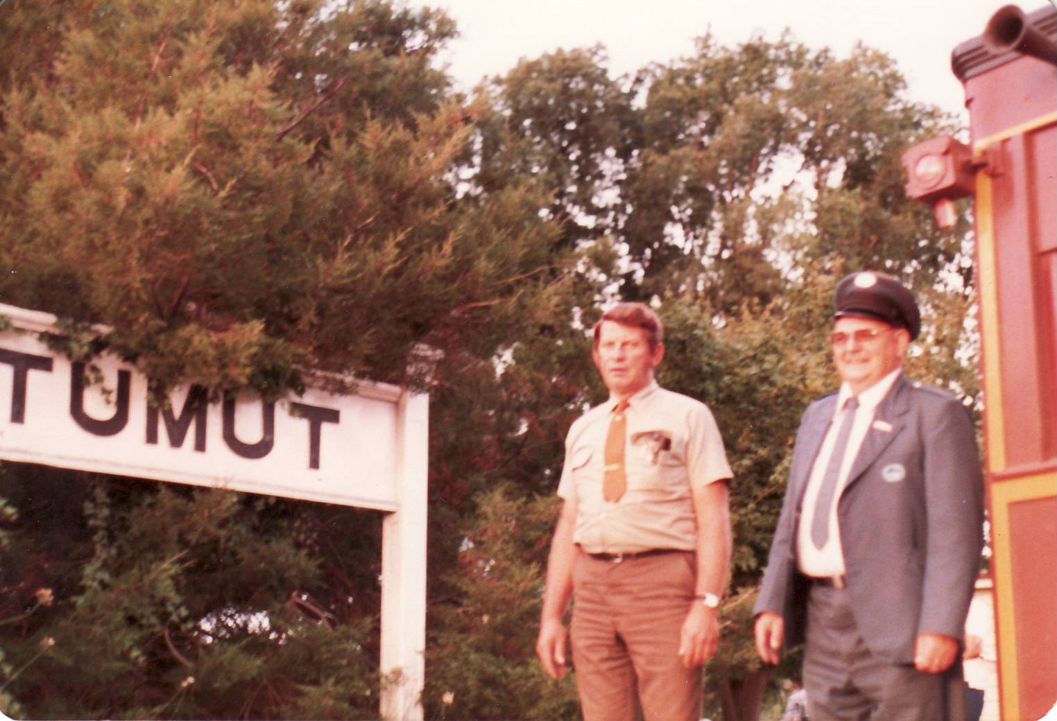 Ready for departure, Driver (Ken Frost) &  Guard (Wally Fraser) pose for photos.