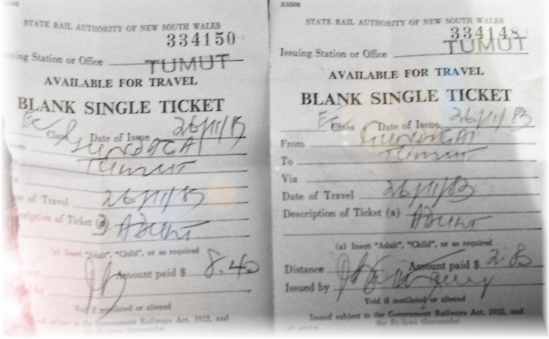 Two tickets for the last train for the Gundagai to Tumut journey. (The one on the left is for 3 adults, while the on on the right is for one adult @ $2.80 each passenger.)